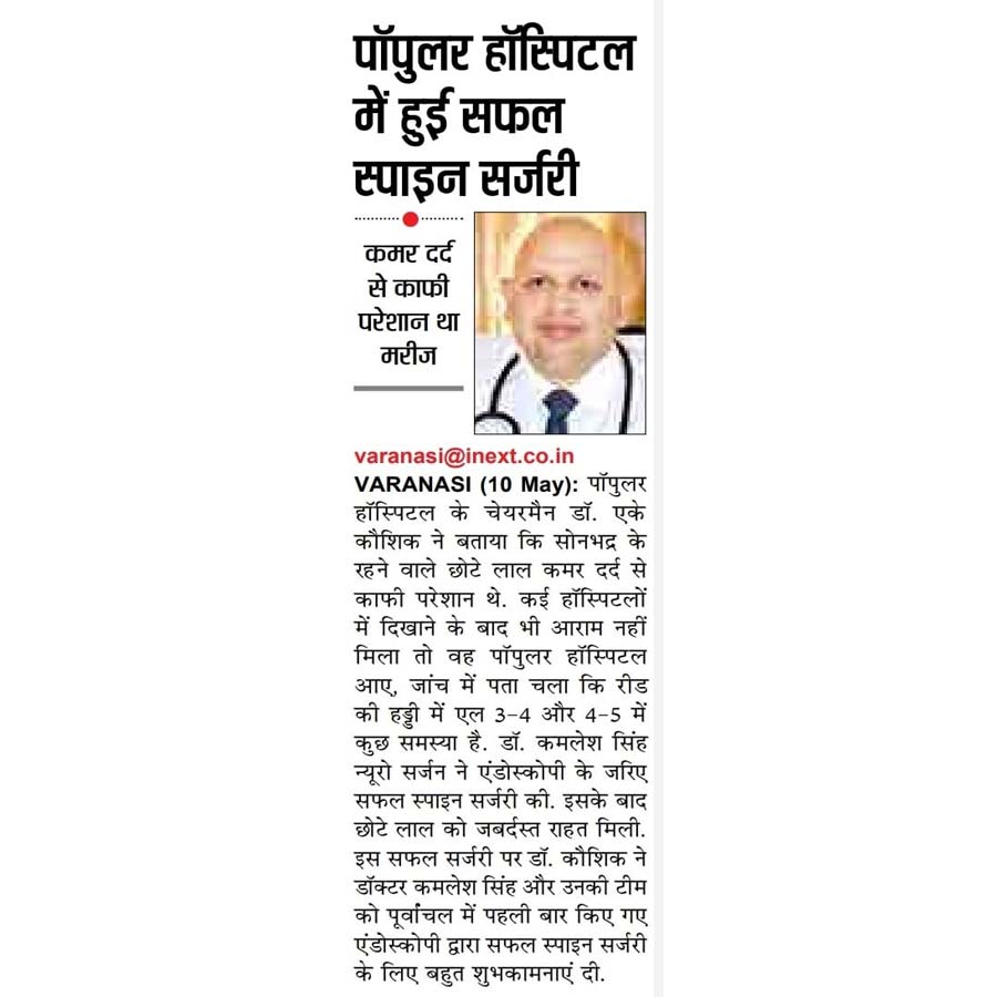 First Endoscopic Spine Surgery done by Dr. Kamlesh Singh, Mch (Neurosurgery) on 10th May 2022 at Popular Hospital, Varanasi