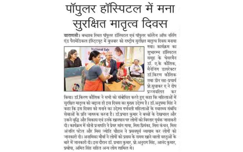Safe Motherhood day was Celebrated at Popular Hospital Varanasi in the presence of Dr. A.K.Kaushik, Chairman - Popular Group of hospitals, MD - Dr. Kiran Kaushik and Dean Prof. Sudhakar. The event was celebrated at Popular College of Nursing and Paramedical Institute.